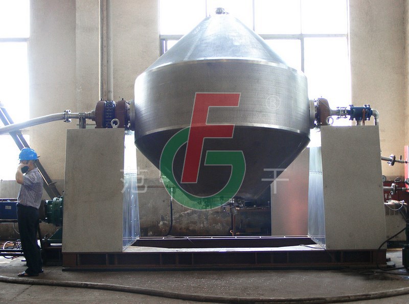 SZG雙錐回轉真空干燥機為雙錐形的回轉罐體,罐內在真空狀態下,向夾套內通入蒸汽和熱水進行加熱,熱量通過罐體內壁與濕物料接觸。濕物料吸熱后蒸發的水汽,通過真空泵經真空排氣管被抽走。由于罐體內處于真空狀態,且罐體的回轉使物料不斷的上下,內外翻動,故加快了物料的干燥速度,提高干燥效率,達到均勻干燥的目的。
