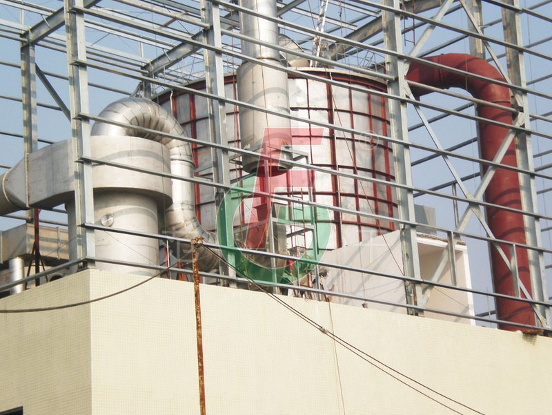 1.塔徑塔高作了相應(yīng)的調(diào)整,既保證粉料干燥之前達(dá)不到塔壁,又可保證粉料的熱風(fēng)停留時(shí)間而完成低溫干燥;塔壁設(shè)有夾套冷風(fēng)冷卻裝置,確保料液不會(huì)粘結(jié)在塔壁上因局部溫度過(guò)高而產(chǎn)生軟化、熔融甚至焦化現(xiàn)象;錐度增大,錐體上安裝空氣震擊器,用壓縮空氣脈沖式地震擊筒體,把吸附在筒體上的粉料順暢地?fù)袈湎聛?lái)。