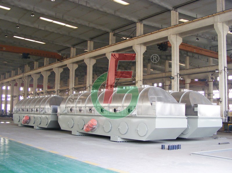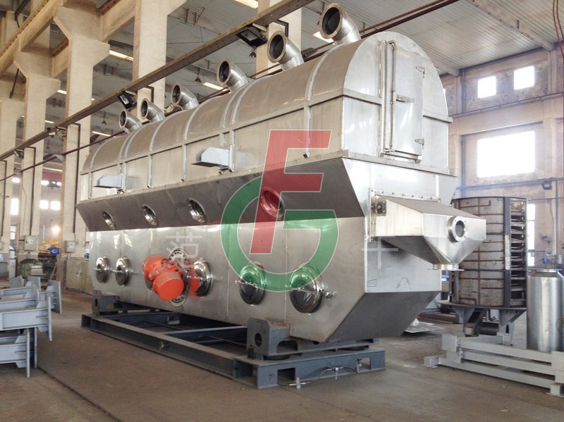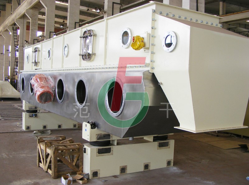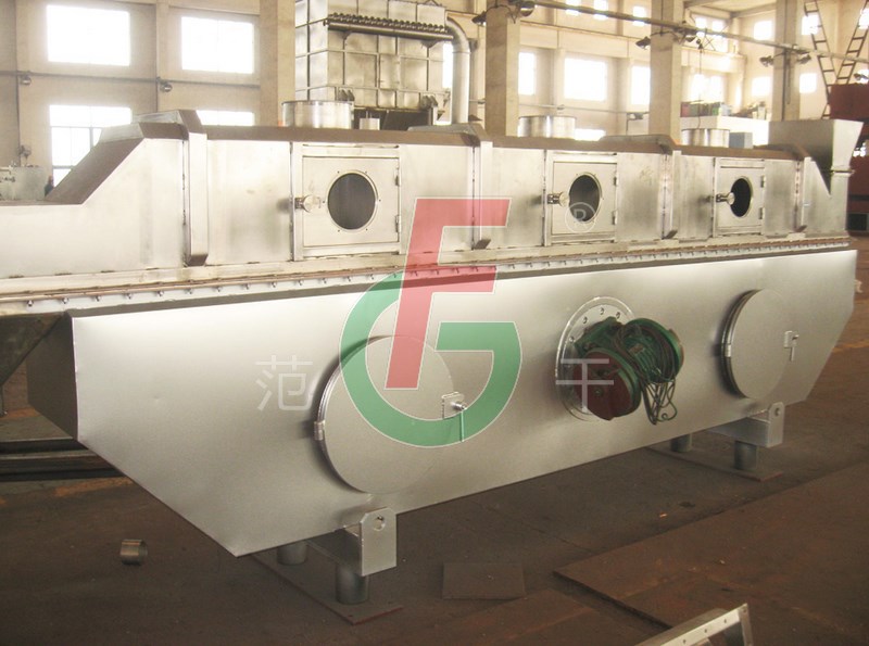 物料自進(jìn)料口進(jìn)入機(jī)內(nèi),在振動作用下,物料沿流化床水平方向拋擲向前連續(xù)運(yùn)動,熱風(fēng)向上穿過流化床同待處理物料進(jìn)行熱質(zhì)后,濕空氣經(jīng)旋風(fēng)分離器除塵后由排風(fēng)口排出,干燥物料由排料口排出。