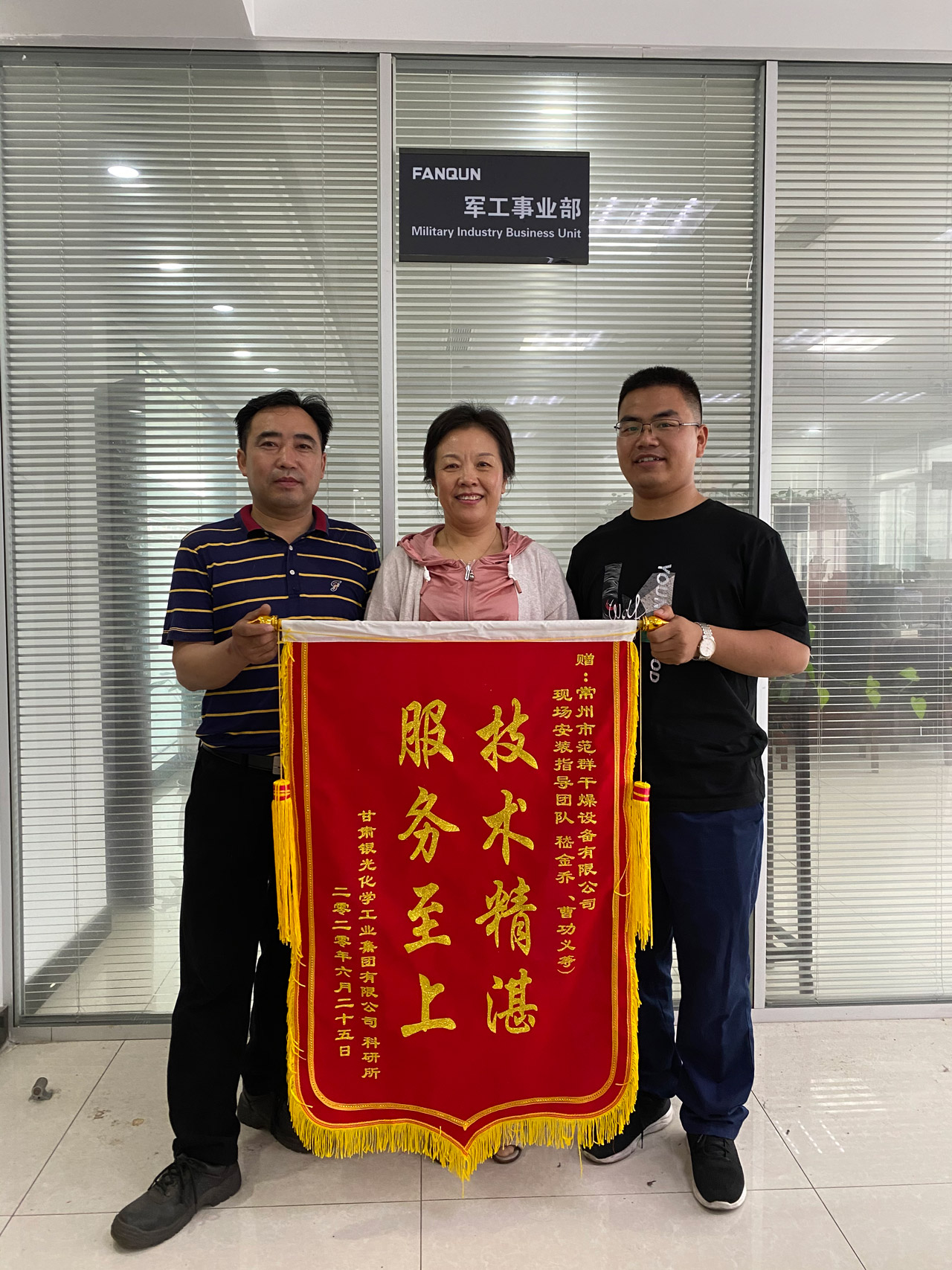 3月 26日,常州范群派出以嵇金喬為主的現(xiàn)場安裝指導(dǎo)團隊,該團隊秉承“服務(wù)于用戶,創(chuàng)精品工程”的理念,他們克服了高原反應(yīng),水土不服的生理不適;克服了疫情導(dǎo)致工期延誤的影響;克服了項目指導(dǎo)安裝中所遇到的各種困難,不屈不撓、加班加點、通宵作業(yè)、確保項目按時完工并通過驗收。常州范群這種全心全意服務(wù)于客戶的態(tài)度、吃苦耐勞打硬仗的精神,也獲得用戶的高度認可。為此,甘肅銀光化學(xué)工業(yè)集團有限公司科研所特別為常州范群現(xiàn)場指導(dǎo)安裝團隊頒發(fā)了“技術(shù)精湛 服務(wù)至上”的錦旗。他們用自己的不懈努力為常州范群、為自己贏得了榮譽。