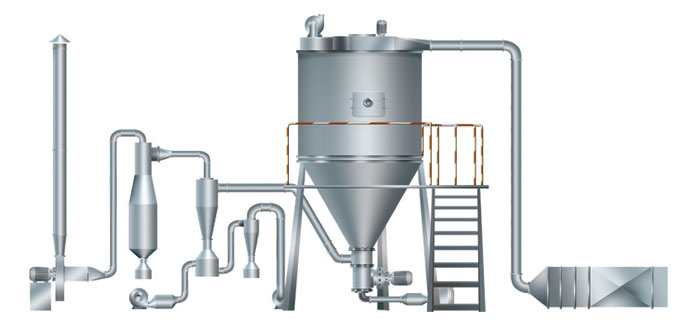 空氣經過濾和加熱,進入干燥器頂部空氣分配器,熱空氣呈螺旋狀均勻地進入干燥室。料液經塔體頂部的高速離心霧化器,(旋轉)噴霧成極細微的霧狀液珠,與熱空氣并流接觸在極短的時間內可干燥為成品。成品連續地由干燥塔底部和旋風分離器中輸出,廢氣由引風機排空。